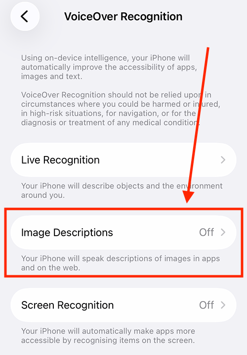 4. On the VoiceOver Recognition screen, tap Image Descriptions.