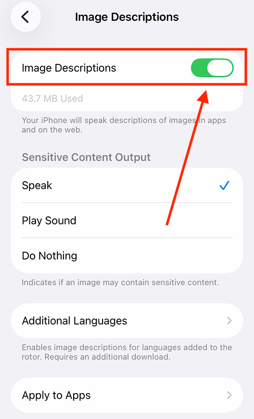 5. Tap the toggle switch for Image Descriptions to turn it on. The first time you do this, your device will download image recognition in the background, so you will need to be connected to the Internet.