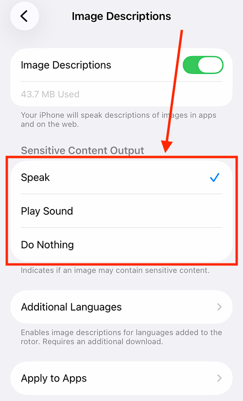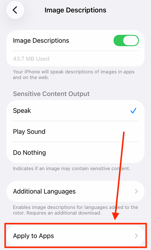 7. By default, VoiceOver will describe images in all the apps you use. If you want to choose which apps Image Recognition works with, tap Apply to App and tick/untick apps as required.