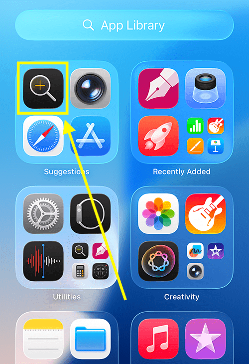 1. You can find the Magnifier in your App Library. Swipe through your Home pages of apps until reach the App Library page. Tap the Magnifier icon found in the Utilities folder.