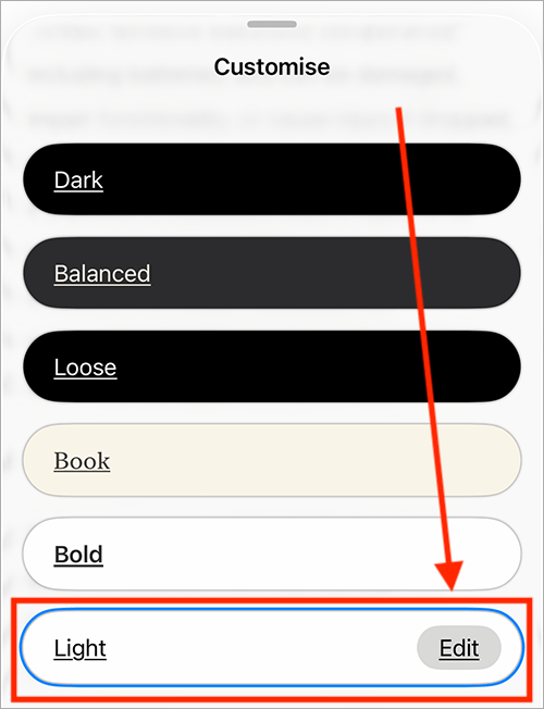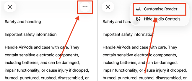 11. You can change the appearance of the Reader view to make the text even easier to read. You can change the colours, the font, the font size, and more. Tap the ellipsis button ( … ) in the top-right, then select Customise Reader.