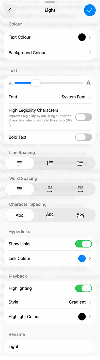 | Style | Tap Style to choose a new style for how spoken text is highlighted. You can choose from Gradient, Background, or Underline. |