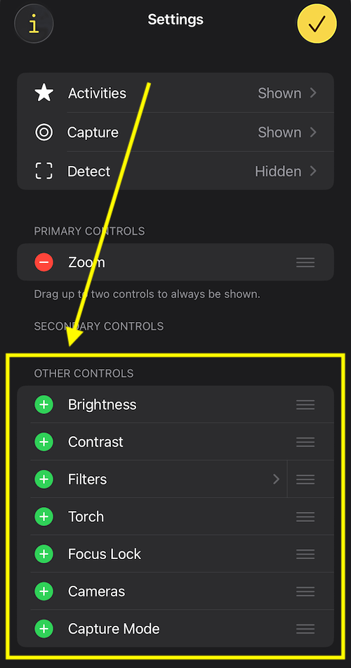 19. In the Other Controls section, tap the + (plus) button next to the controls you want to use. This will add the controls to the Secondary Controls section.