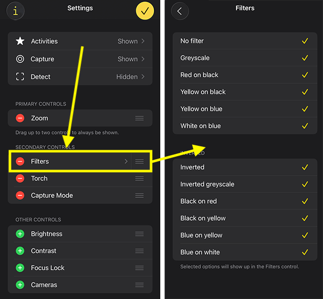 18. There are several features you can add to the Magnifier to make what appears on the screen easier to see. These features include Colour Filters, Brightness and Contrast controls, a Torch, and a button to make it easier to switch between capture modes. To add any of these features, tap the Settings button on the controller.